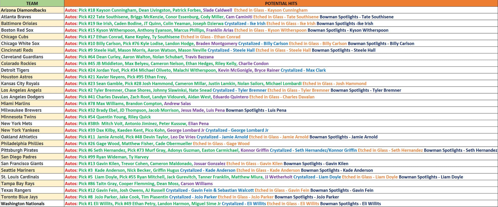 A Pick Your Team break is exactly what it sounds like. You can choose what team you wish to purchase and every card for that team is yours. Prices are based on the hits available to your team in each product and is an excellent way to add to your collection.